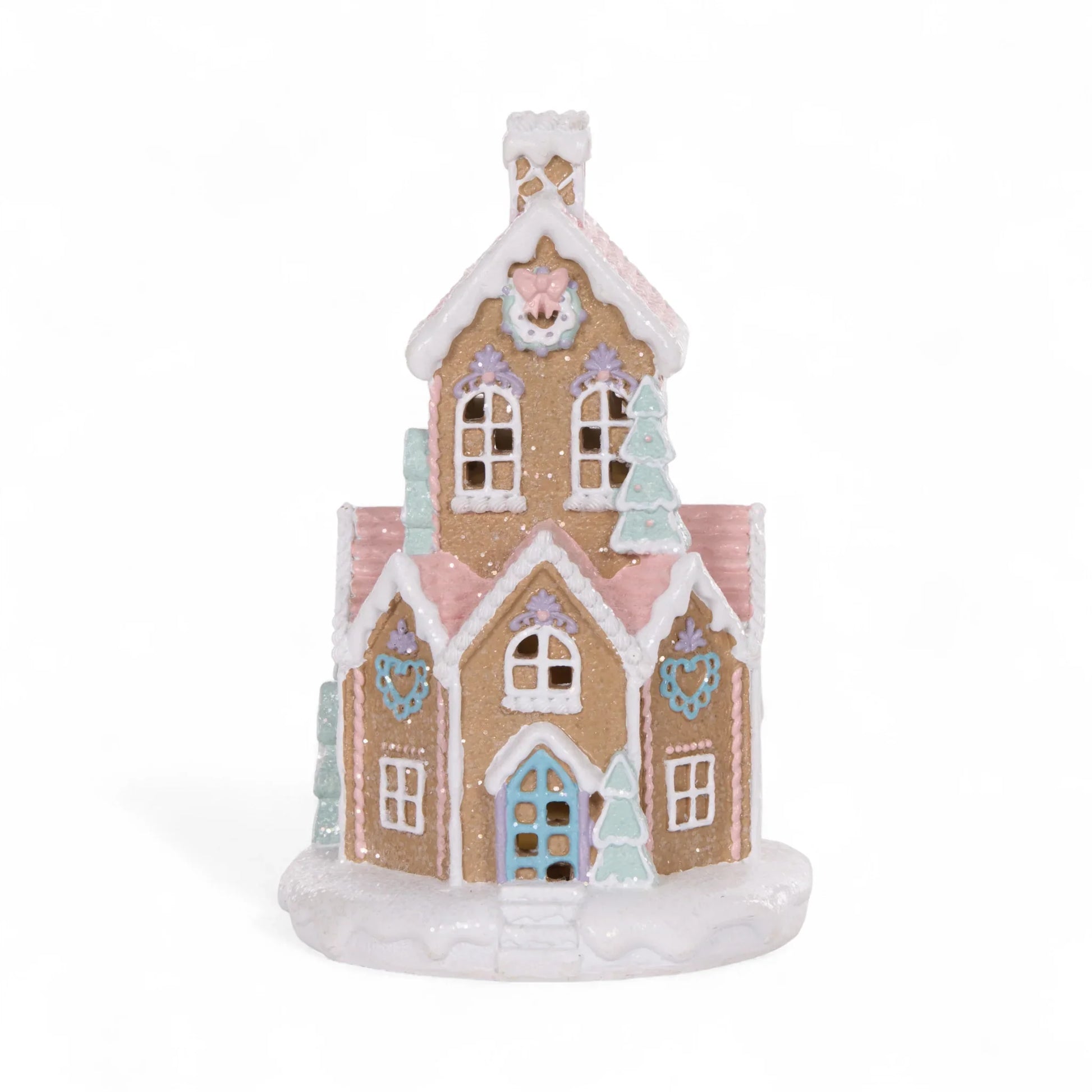 Christmas sweetness meets pastel perfection with this enchanting 23cm piped round pastel gingerbread house that transforms any space into a fairy-tale wonderland. The delightful soft pink, mint green, and cream colours with intricate piped detailing create charming confectionery magic, whilst the multi-level design and tiny Christmas trees embody whimsical holiday elegance with storybook appeal.