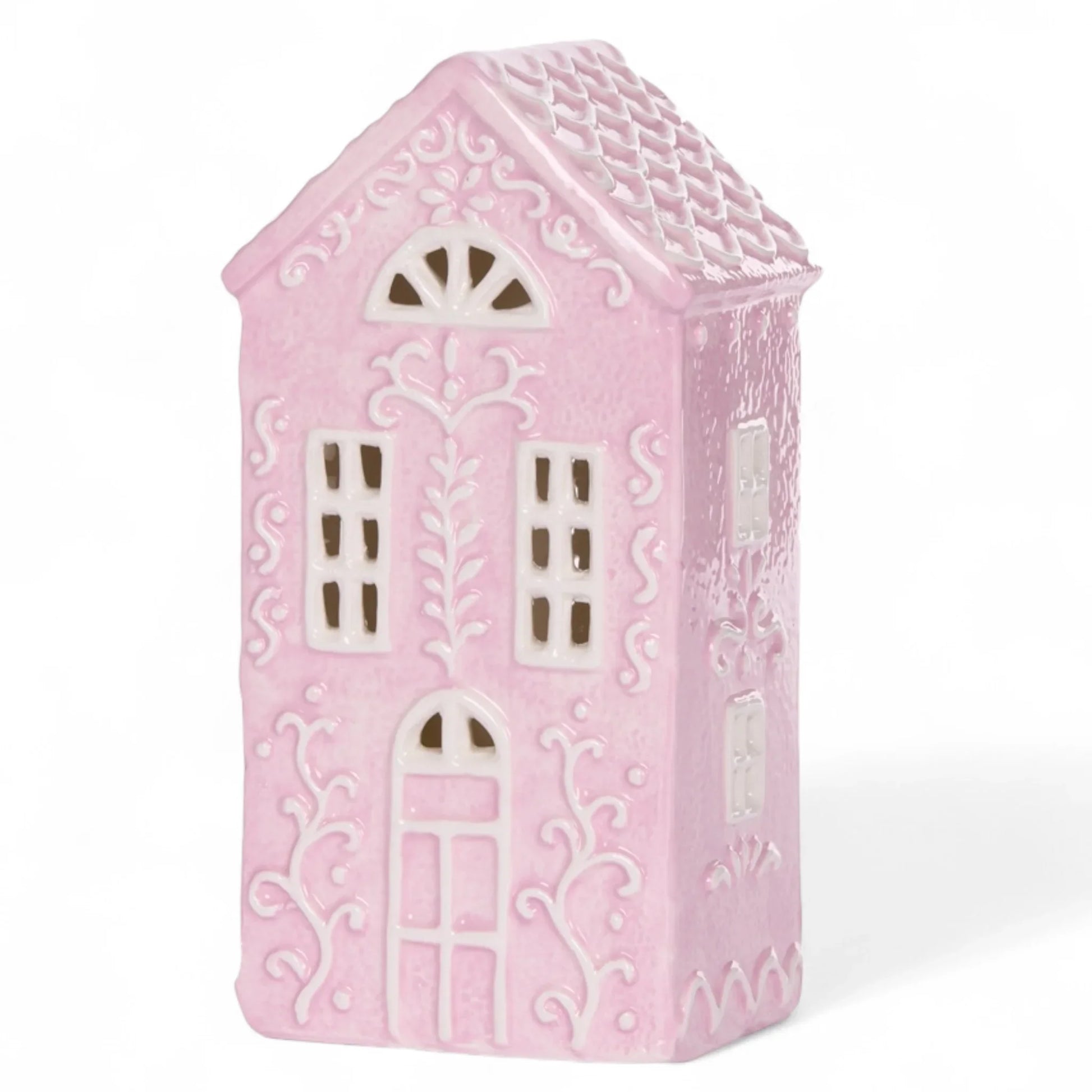 This enchanting LED pink gingerbread townhouse brings whimsical fairy-tale charm with intricate gingerbread detailing and soft pink ceramic finish.